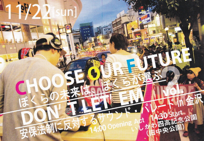 9月19日に強行採決された「安保法制」に反対し、廃止を求める石川県在住の若者を中心にした抗議行動、第2回サウンド・パレードが下記のように計画されています。県民の皆様のご参加を呼びかけます。