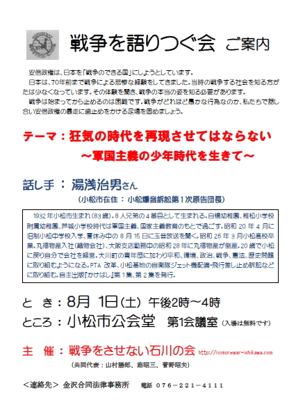 戦争をさせない石川の会では、 15年戦争の教訓を「伝え」「聞く」ことで戦争をさせないために市民として必要な認識をえる機会とするため、県内各地で戦争体験を語り、伝える活動を計画しています。