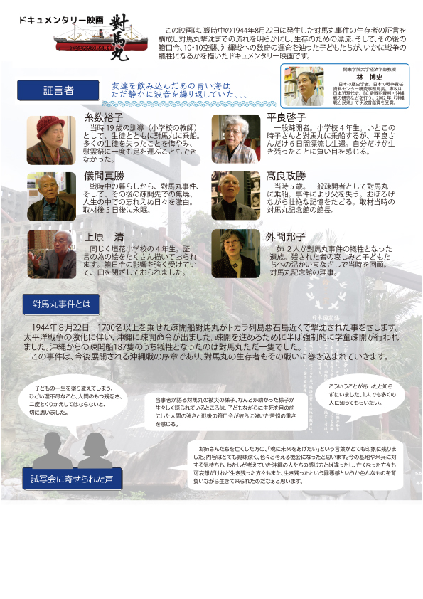 内容:映画「對馬丸〜子どもたちの見た戦争」(105分)上映会