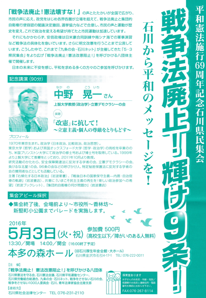 戦争をさせない石川の会も参加する「戦争法の廃止!憲法改悪阻止!」を呼びかける八団体が、5月3日に金沢市・本多の森ホールにて平和憲法施行69周年記念石川県民集会を開催します。