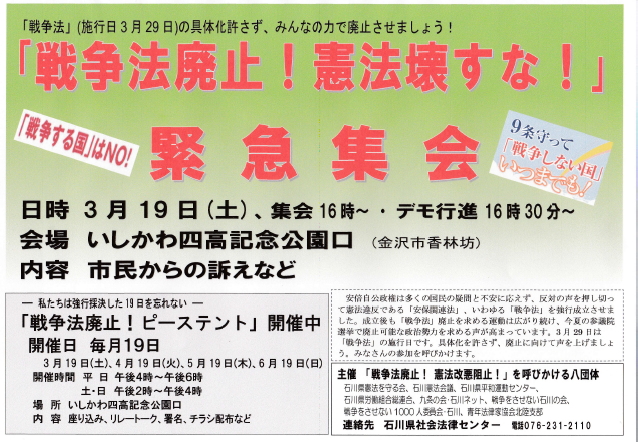 3月19日(土)は午後2時から午後4時までピーステントを行い、引き続き午後4時から<緊急集会&デモ行進>を計画しています。詳細は下記の案内チラシをご覧ください。多数のご参集を呼びかけます。