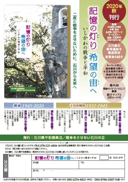 戦後75年の今夏、戦争の記憶が薄れる中で、県内での戦争の加害と被害の事実を示す遺構、記念碑、その他の記録集を集大成した『記憶の灯り 希望の宙へ いしかわの戦争と平和』(A4判 132頁 定価1,300円)を刊行します。監修は日本近代史の研究者として石川県立歴史博物館学芸課長を経て、現在、金沢星稜大学教授の本康宏史氏に依頼しました。